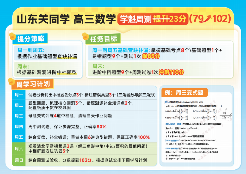 这套科学的提分方法已经帮助了众多学生实现数学成绩逆袭,山东的关同学就是其中之一。加入前,他的数学成绩仅79分,基础薄弱、题型掌握不扎实,运用清北分层提分法学习后,伴学老师为他精准定位薄弱点,制定了专属计划,搭配一对一伴学答疑,最新一次周测数学成绩直接提升至102分,实现了23分的跨越式进步。